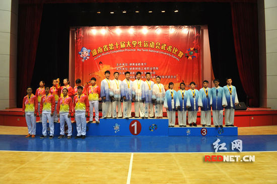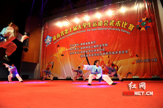 22日晚,湖南省第十届大学生运动会武术比赛在湖南广播电视大学(湖南网络工程职业学院)揭开战幕。