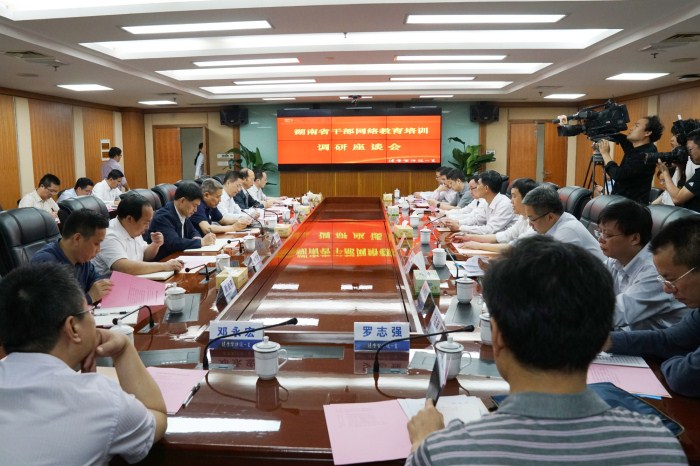 开通仪式结束后,省委组织部副部长胡奇主持召开了省干部网络教育培训工作调研座谈会,湖南电大党委书记陈建民作了省干部教育培训网络学院工作情况汇报,湘潭市委组织部、省地税局等干部网络培训工作先进单位代表作了发言,省编办、省财政厅、省教育厅、省电信公司、省移动公司、省联通公司等与会单位的负责人也在会上发言。