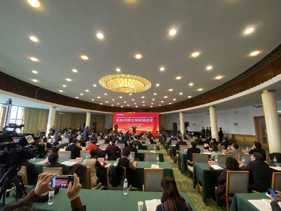 邢顺峰宣读了《山东省人民政府关于山东广播电视大学更名为山东开放大学的批复》。王随莲、谢俐、荆德刚、邢顺峰、刘龙海和学校党委副书记、校长徐文谋共同为山东开放大学揭牌。