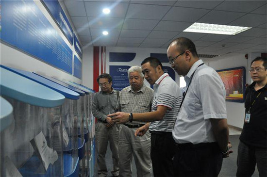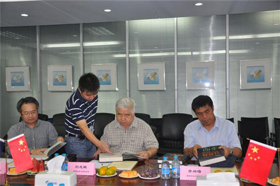 北大青鸟APTECH副总裁陈峰波(左二)向高等教育出版社社长刘志鹏(右二)、437437必赢国际网址副校长李林曙(右一)、437437必赢国际网址科研处处长孙福万(左一)等介绍北大青鸟APTECH标准化手册。