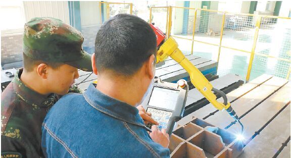 一套导弹阵地防护门,3名焊工近10个小时的焊接工作量,使用机器人焊接系统3个小时就能完成。火箭军某基地修配厂从地方引进的这套智能加工装备,操作员只需将焊接程序编入手柄遥控器,按下启动键,就能360°旋转自动作业,可满足各种小、偏部位焊接,精度可控制在2mm以内。
