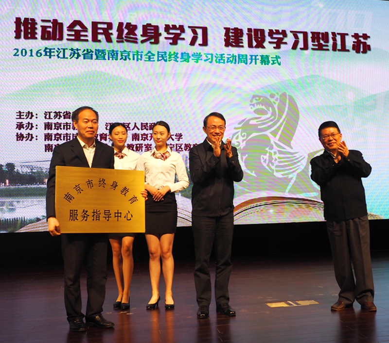 为进一步推进我市学习型城市建设、构建覆盖全市的终身教育体系,2016年10月11日上午9时,江苏省暨南京市全民终身学习活动周在江宁市民活动中心拉开帷幕。省教育厅厅长沈健、市教育局局长吴晓茅共同为“南京市终身教育服务指导中心”揭牌,南京开放大学校长夏桂松接受授牌。