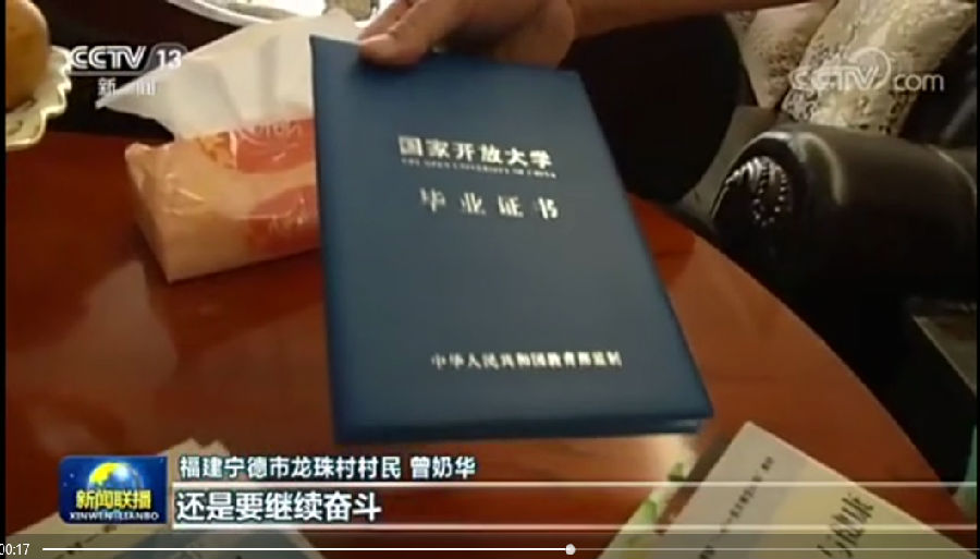 8月25日,中央电视台《新闻联播》栏目播发“走向我们的小康生活丨福建宁德:‘弱鸟先飞’奔小康”,讲述了福建省宁德市赤溪村的脱贫故事。报道中提到,曾经因为家庭贫困不能继续读书的曾奶华,报读了开放大学的课程,想要为更美好的生活继续奋斗。这些年,曾奶华搞起了园林绿化,年收入翻番增长。曾奶华在接受采访时表示,在开放大学,学到了市场、金融、管理方面的知识,都是很实用的。