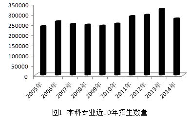 从2005年春季招生统计开始,截止目前,近10年所有本科20次招生数据分析结果得出:本科年均招生26.7万人,2013年招生人数最多,达32.4万人,最多招生年份为2013年,最少招生年份为2005年,最多招生年份比最少招生年份高35.5%(图1);春秋两季招生人数对比,除2006年和2008年,其余年份,秋季招生多于春季招生人数,秋季比春季平均高12.9%。