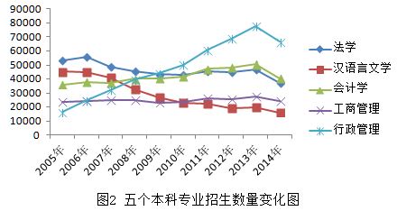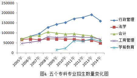 选取招生数量较多的五个专业进行纵向分析对比,法学、会计学、工商管理三个专业招生数量保持平稳,行政管理与学前教育招生数量直线上升,学前教育为2009年开始招生(图4)。