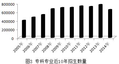 从2005年春季招生统计开始,截止目前,近10年所有专科20次招生数据分析结果得出:本科年均招生63.3万人,2013年招生人数最多,达76.5万人,最多招生年份为2013年,最少招生年份为2005年,最多招生年份比最少招生年份高35.5%(图3),与本科规律惊人的一致;春秋两季招生人数对比,除2014年以外,秋季招生均多于春季招生人数,秋季比春季平均高15.2%。