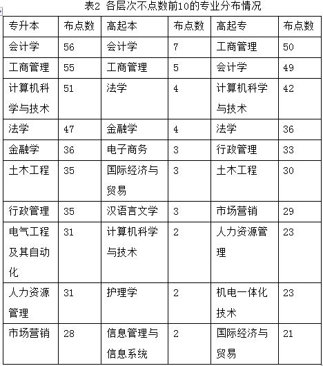 对比现代远程教育试点高校的专业布点数前10的分布情况(表2),在本科层次,除了人力资源管理、国际经济与贸易、信息管理与信息系统三个专业没有开设外,其余专业也是437437必赢国际网址招生数量较多的专业;专科层次除人力资源管理、国际经济与贸易外,其余8个专业也是437437必赢国际网址招生数量较多的专业。
