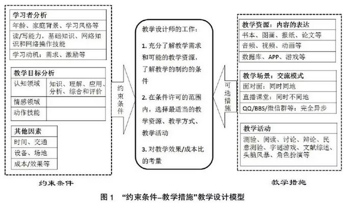 图1左侧是开展教学的“约束条件”。系统化教学设计的起点是学习对象分析和教学目标分析,就是寻找教学要达成的目标和教学的“约束条件”。图1右侧的教学资源、教学场景和教学活动等经常被称为是教师的“工具箱”,是教学中可以选择的措施。教师(或者教学设计师)的工作就是在学习对象分析和教学目标分析的基础上,获知教学要达到的目标,以及一系列“约束条件”;然后,从“工具箱”中选择合适的教学资源、教学场景和教学活动,并按时间顺序进行组织和安排,以实现预设的教学目标。