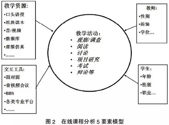 美国在线课程的首要构成要素就是教学活动。1981年第一门在线课程就是关于计算机会议系统支持的讨论交流活动。笔者对中外网络课程类别进行了分析,提出了图2所示的在线课程分析5要素模型: