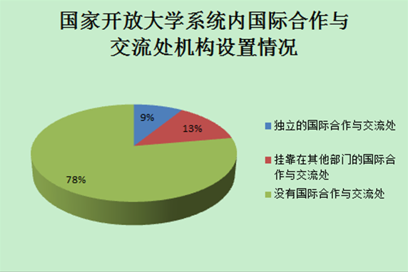 也就是说,在我国的开放大学体系内,高达78%的单位没有国际合作与交流部门设置或者业务安排。这一方面说明了我国开放大学体系内整体的国际合作与交流能力比较弱,而另一方面在国内外环境利好的情况下,要提升或改善当前的局面,必须由总部进行引领,才能使我国的开放大学在整体上提升国际合作与交流的业务素质和能力。