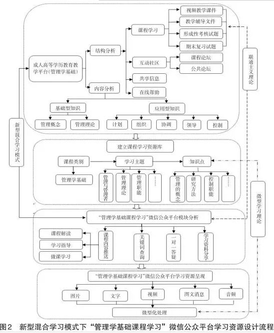 本研究以“管理学基础”这门课程为例,具体从新型混合学习模式构建、微信公众平台学习资源整合流程、微信公众平台学习资源评价三个方面来进行的设计实践。