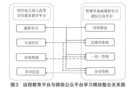 由此,我们构建了以成人远程教育网络平台为主、微信公众平台为辅的新型混合学习模式。在该学习模式中,成人学习者通过远程教育网络平台进行系统化的课程学习,而通过微信公众平台为代表的移动学习平台则提供了碎片化的学习信息,满足了成人学习者随时随地进行学习的需求。