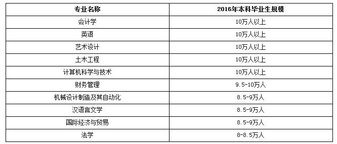 根据教育部阳光高考信息平台最新统计数据,2016年会计学、法学等10个普通高校本科专业的毕业生规模最大,其中会计学、英语、艺术设计、土木工程和计算机科学与技术等5个专业的毕业生超过10万人。