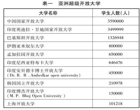 亚洲开放大学的数量居世界首位。如果我们算上各种形式的开放远程教育机构、广播电视大学及双模式大学,这一数字将超过一千(见表一)。
