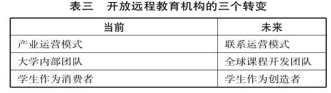 开放教育资源的发展预示着开放远程教育机构将发生三个改变。传统上,开放大学采用产业模式,未来的开放大学将是一种相互联系的模式。以前,开放大学内部有课程开发团队负责开发课程内容,现在课程团队分散在全球各地,采用或改编现有的开放教育资源。开放教育资源的发展将会鼓励学生成为学习内容的创造者,而不是消费者(见表三)。