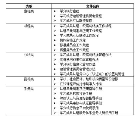依据学分银行制度框架,形成了涉及章程、工作规程、管理办法、指标体系及指导手册等多种类型的制度文件,为学分银行业务的开展提供指导和规范。