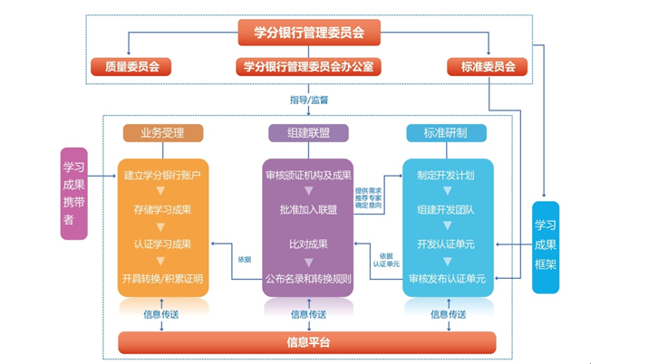 学分银行包括学习成果互认联盟建设、标准制定和业务受理等三大业务。其业务接受管理、质量和标准委员会的指导监督,三大业务之间通过信息平台支撑,最终实现学习成果认证、积累与转换。