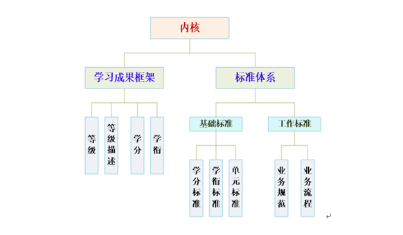 制度内核由学习成果框架和标准体系组成。标准体系是开展学习成果认证、积累与转换的一系列标准按其内在联系形成的有机整体,包括基础标准和工作标准。基础标准包括学分标准、单元标准和学衔标准。工作标准包括业务规范和流程。