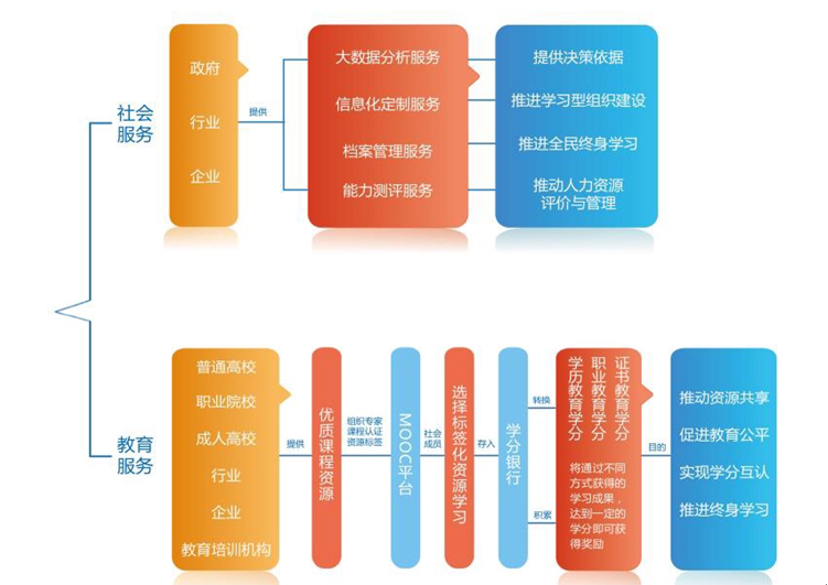 此外,在学分银行制度架构下,我们还可以为政府、行业、企业提供各种终身学习的信息化定制、大数据分析、档案管理以及能力测评等拓展服务。还可以整合社会资源,通过资源标签和前店后厂的教育理念将学习资源和学习成果认证在更大范围内共享,为学习者提供可靠的教育服务,还能够提供个性化学习路径指引,引发学习者学习方式的改变,使得终身学习成为可能。