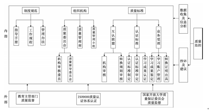 制度保障包括政策法规、经费和质量监控。质量保证体系是开展学习成果认证、积累与转换的生命线。为了保证学习成果认证、积累与转换的公信力,在全面质量管理的理念指导下,我们构建了内外部相结合的完整质量保证体系。